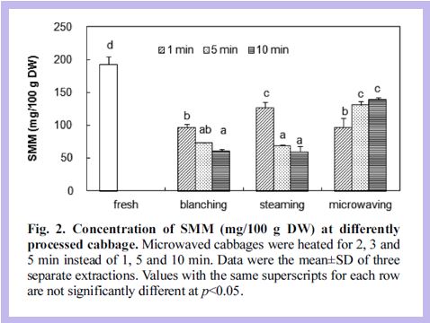 시판되고 있는 제품 10가지 중 8~9가지는 원물을 고온에서 끓여 압착하는 열수 추출한 것인데, 이 과정에서 높은 열에 의해 영양성분이 다량 파괴되는 단점이 있습니다. 특히, 양배추의 비타민U 성분은 열에 극도로 민감하기 때문에 열수 추출하면 대부분 파괴되어 활성을 잃게 됩니다. (참고로 비타민U(MMSC)는 위장에 좋은 약으로 국내에서 대박이 난 카베진**의 주요 성분입니다.) 이 성분이 열에 얼마나 약한지 논문을 통해 확인해보겠습니다.