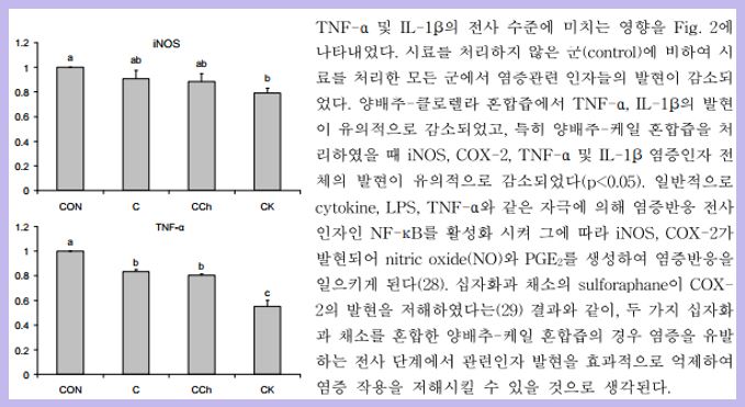 부산대학교에서 진행한 <HCl-Ethanol로 유발된 흰쥐의 항위염 효과>연구를 보면 염증을 유발한 실험 쥐에게 양배추 추출물을 투여한 결과, 염증 관련 인자(iNOS, COX-2, TNF-α)들의 발현이 10~18%나 억제되었습니다.