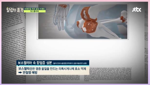 한국식품영양과학회지에 실린 남다은 연구팀의 <보스웰리아 추출물의 골관절염 억제 효과 연구>논문을 보면 염증을 유발한 세포에 보스웰리아 추출물을 처리한 결과, 염증을 유발하는 효소인 5-lipoxygenase의 활성이 79% 억제되었습니다.