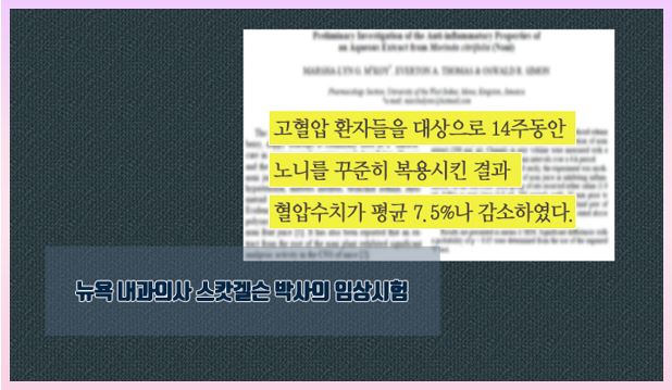 노니는 혈압을 낮추는 것에도 상당한 효능이 있는데, 뉴욕 내과의사 스캇겔슨 박사의 연구를 참고하면 고혈압 환자들에게 노니 추출물을 복용하게 한 결과, 환자들의 혈압 수치가 평균 7.5%나 감소한 것으로 나타났습니다.